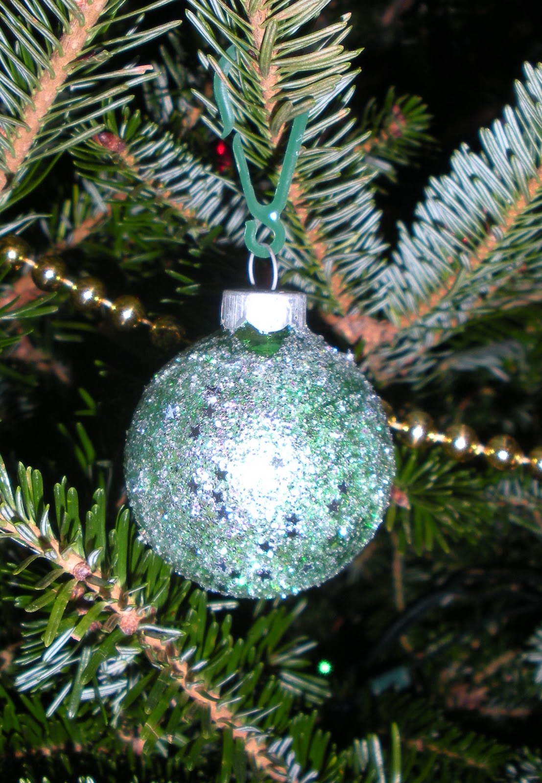 I learned glitter was my friend. I coated the ornaments in mod-podge, then added silver glitter, white glitter, and cellophane glitter and coated them all again in mod-podge to prevent flaking. I really like the one in cellophane! It has a nice texture. The two green ones are my favorite.